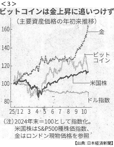 トランプのFRB支配策動によるドル信認の低下、そしてトランプ減税によるアメリカ財政悪化によるアメリカ国債「安全神話」の動揺、さらにはアメリカ議会混乱による政府機関閉鎖の長期化。市場にドル離れ材料は強いが、ここで問題にしているのは基軸通貨として「ドルに代わるもの」という考察であり、そこで金という候補は、もちろん「ドルではなくて金」とは言えずしかし「ドルも金も」という傾向は定着していくように見える。