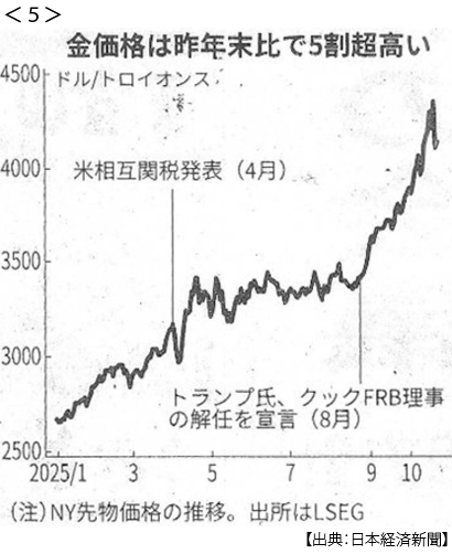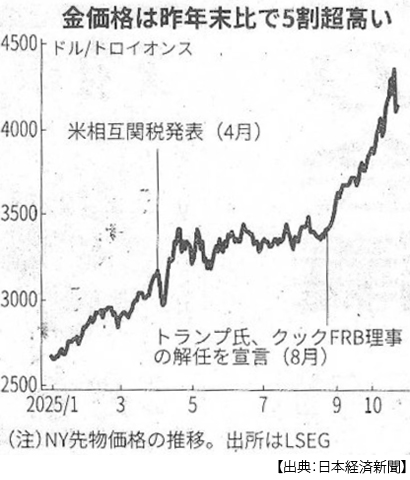 しかし金価格が最高値を連日のように更新し、ドルの信認が急速に低下しているその最大の材料はFRBの政治的独立性に対する疑念、すなわちトランプの金融政策への露骨な介入、圧力が不安視されていることが問題だという認識が強くなっていく。だから現パウエルFRB議長在任中に金価格が2.6倍になったという指標が紹介されたりしていたのだ(9月3日付日本経済新聞)。