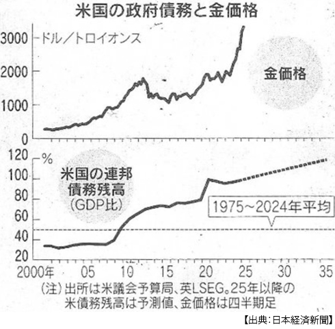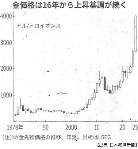 そして10月7日、NY先物でついに金1オンス=4000ドルを突破した。3000ドルを突破したのが3月だから半年余りで1000ドル高くなったということだ。この現象を長短2つの観点から考察しよう。まず短期的にはこの半年の間に、トランプ関税、移民排斥、中央銀行に対する利下げ圧力、いな圧力にとどまらないFRB議長理事解任などによる中銀支配の動きが、ドルの信認低下を加速させたことは間違いない。