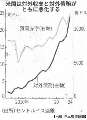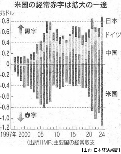 さて話をISバランスに戻そう。経常収支=(国内貯蓄)-(国内投資)+(財政収支)という等式だ。アメリカの対外赤字は、過剰消費によって投資が貯蓄を上回り、財政も赤字、いわゆる「双子の赤字」という対内バランスを表している。一方日本の黒字とは、国内貯蓄が国内投資にまわらず、財政は赤字だが民間貯蓄がそれを上回っているという状態を示す。そう、どちらも不健全だ。でもアメリカは減税で消費と投資を刺激し続け、財政赤字は拡大する。このアメリカの国内需要増加に向けて日本や韓国は輸出を増やして外貨を稼ぎ、これを国内投資にまわすのではなく、米国債を買うことでアメリカの財政赤字をファイナンスしている。これが真っ当で、持続可能な関係なのだろうか。アメリカの経常収支赤字は2000年からの25年間で3倍に膨らみ、ついに1.1兆ドルに達している。