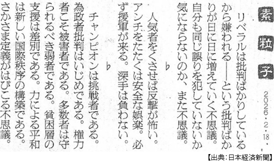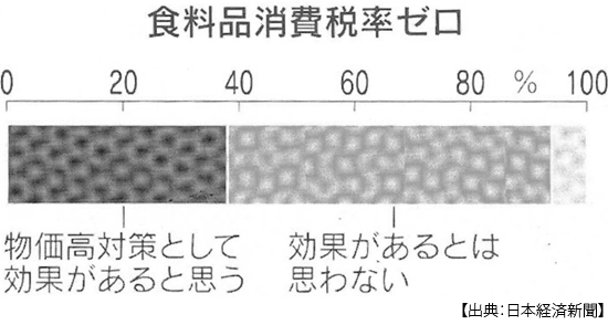 たしかにネット世論では、消費減税支持が圧倒多数だろう。いやオールドメディアでも、例えば朝日新聞の世論調査(2月16日)を見れば、税率維持が36%、2年間ゼロが28%、ずっとゼロが31%で、たしかにゼロが6割なのだがしかし維持も36%なのだ。同時期の日本経済新聞とテレビ東京の世論調査では、財源との関係を明示しての問いで、「赤字国債を発行してでも税率を下げるべきだ」は31%にとどまり、「社会保障の財源を確保するために税率を維持するべきだ」は59%だった。そして食料品の消費税率ゼロが物価高対策として「効果があるとは思わない」との回答が56%を占めていた。